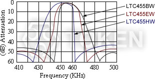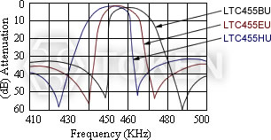 Part Number Center Frequency (fo)(kHz) Insertion Loss (dB)max Pass Band Ripple (dB) max 6dB Band Width (kHz) min 40dB Band Width (kHz) max LTC455U 50dB Band Width (kHz) max LTC455W Spurious Attenuation fo±100kHz (dB) min Input / Output Impedance (Ω)