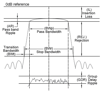 All ranges of the saw components not including the Passband. The Rejection can also be referred to as the Rejection Range, or Stop Band. We can refer to this as the range in which the Relative Attenuation is larger than the specified Rejection side. With proper material selection and design, Rejection of 50dB, or greater, is possible within a wide selection of fractional bandwidths and shape factors.